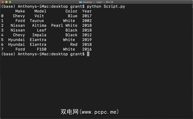 DF = pd.read_excel(Cars_Path)最后,您要查看DataFrame,以便打印结果。使用DataFrame变量作为参数,在脚本末尾添加一条打印语句:
