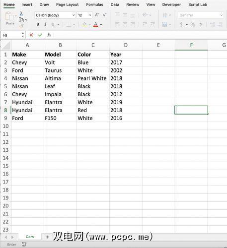 在此示例中,我们使用一个示例数据集:一个名为 Cars.xlsx 的Excel工作簿。