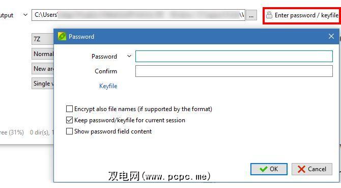 对于7-Zip,请在加密标题下键入两次密码。请确保将加密方法从 ZipCrypto 更改为 AES-256 ,因为前者不安全。 PeaZip用户应单击输入密码,然后在出现的窗口中添加密码。