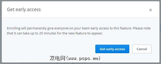 当前,该功能仅对Dropbox可用适用于企业用户。登录Dropbox Web界面,转到帐户,然后找到 Early access 标签。点击新协作工具旁边的注册。这将弹出如下所示的通知。通过单击获得抢先体验进行确认,该功能将在您的整个团队中启用。