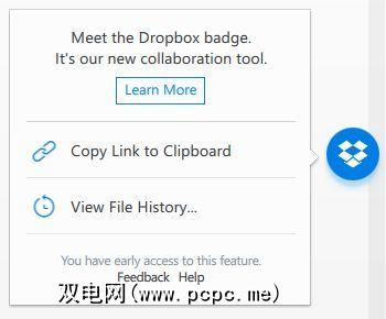 Dropbox徽章仅适用如果Dropbox for Business小组的所有成员都通过Dropbox桌面应用程序打开文档。当您打开文件时,将弹出带有有用信息的Dropbox徽章。您可以从此处将共享链接复制到剪贴板,查看其他人正在查看文档以及查看文件历史记录。自从您上次打开文档以来,后者对于检查团队成员所做的更改很有用。