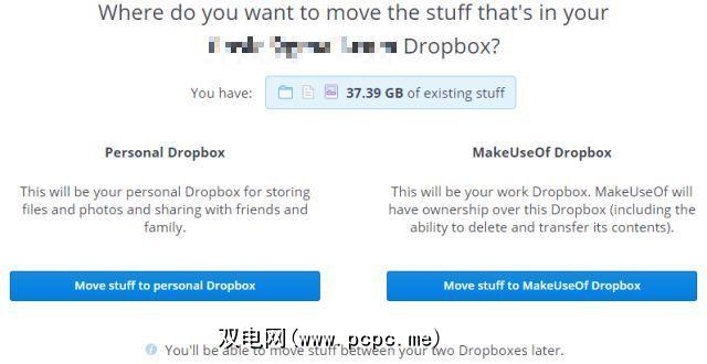 使用您现有的个人帐户升级或加入Dropbox for Business团队有点麻烦。您将必须将个人帐户中的文件与团队帐户合并,也可以将其移动到另一个个人帐户中。我们建议为此设置一个新帐户;您可以在第二步中连接您的个人帐户。