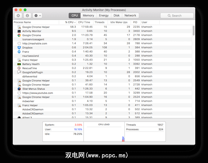 要查看是否有恶意应用程序,请打开活动监视器(来自应用程序>实用工具),然后点击 CPU 标签。在这里,您会看到资源消耗最大的应用。如果某个应用占用了不寻常的大量CPU进程(超过70%),请双击它并选择退出。