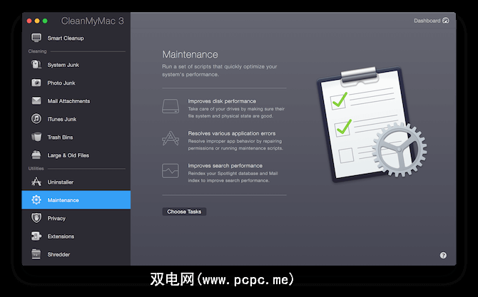 您还可以使用第三方应用程序,例如CleanMyMac 3。他们有一个“维护"部分,专门用于改善Mac的性能和电池运行状况。