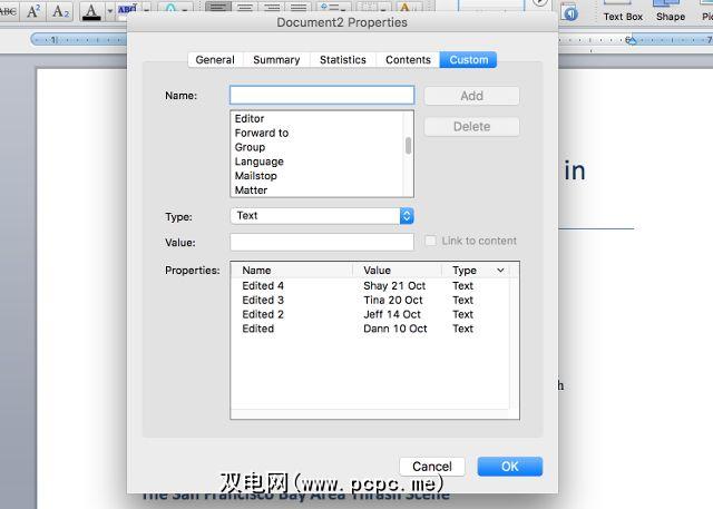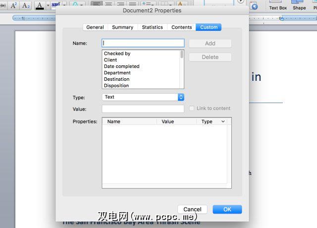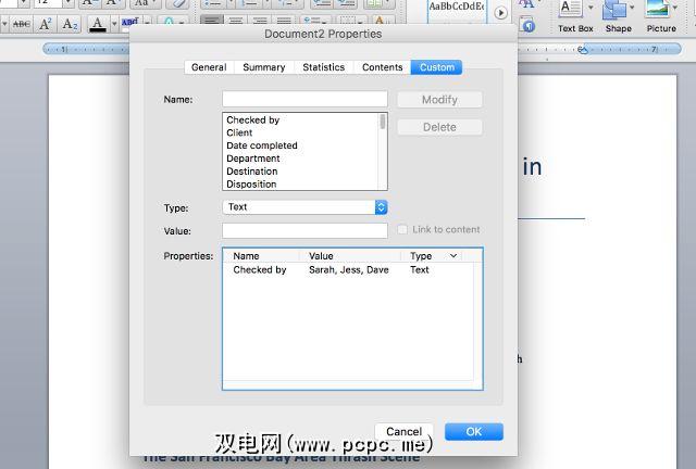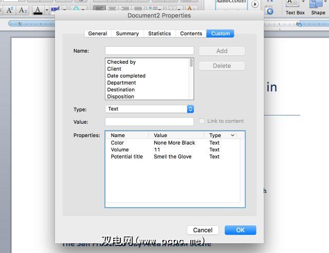 最后一个选项卡是文档属性真正有用的地方。如果您想记录(或查找)关于文档的绝对任何信息,则可以在此处进行操作。对于Word,Excel和PowerPoint,“自定义"选项卡是相同的,因此我将使用Word来截屏。