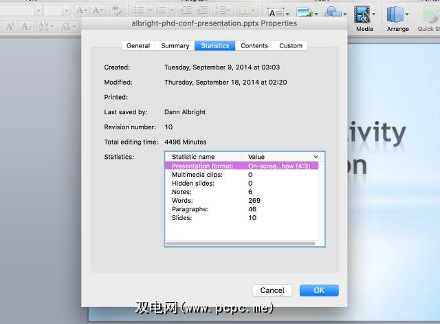 此处收集的统计信息取决于您所使用的程序。例如,PowerPoint包含幻灯片,隐藏的幻灯片,多媒体和便笺的详细信息。