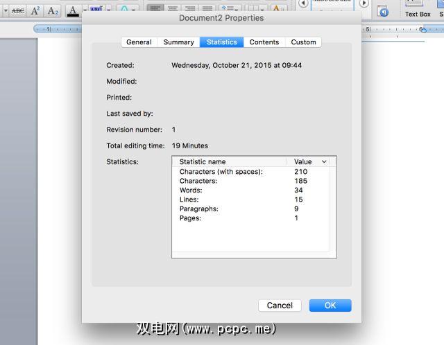 下一个选项卡“统计信息"包含自动计算的数据,例如创建和修改日期,修订号,印刷品,字符,行等。