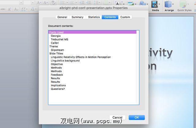 PowerPoint,另一方面,将为您提供有关所使用的字体,演示文稿的主题的信息。当前使用,以及幻灯片的名称。