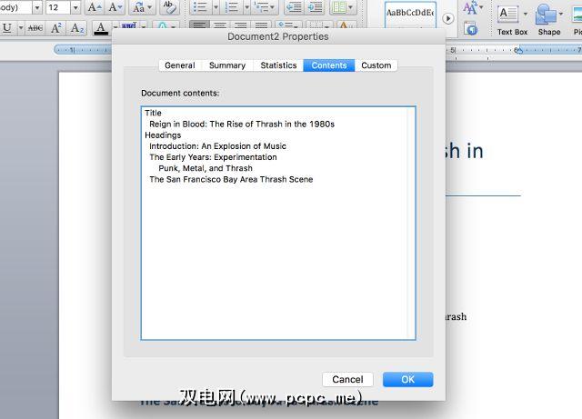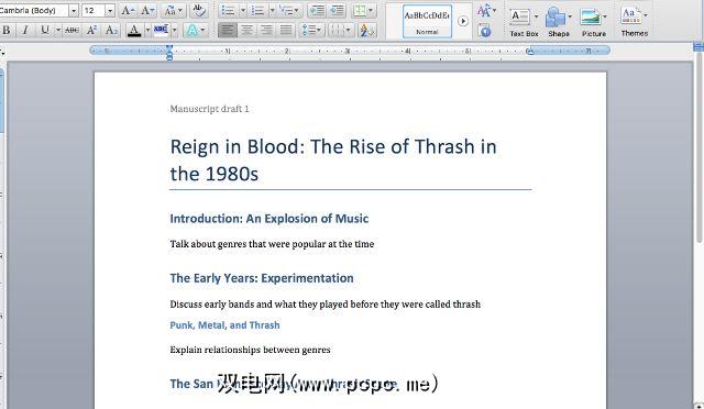 下一个选项卡内容可能不会包含您当前正在处理的许多文档的任何内容。但是,当您看到它有用时,可能会改变。为了向您展示它可以做什么,我们将使用我创建的文档,它是1980年代th动音乐的历史。
