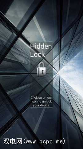 如果您希望在标准锁定屏幕上增加一层保护,您可以添加隐藏锁应用[不再可用]。这基本上会隐藏您的锁屏,显示您上次访问的屏幕的图像,从而使您的手机当前处于解锁状态。隐藏锁使用模糊的解锁按钮,您需要记住该位置才能获得访问权限。在使用中,您的锁定显示屏将显示为解锁状态!