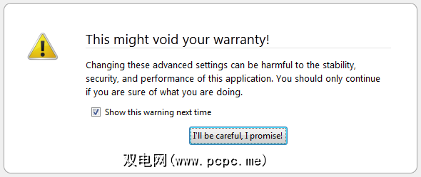 在Firefox中打开新标签页,在URL栏中键入 about:config ,然后按Enter。确认警告并保证会小心。