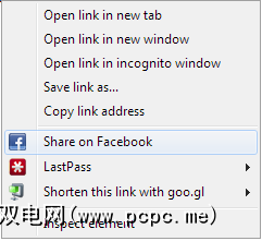 由于Facebook for Chrome也集成到Chrome的右键菜单中,因此您可以通过右键单击项目轻松地通过URL共享任何内容并从菜单中选择在Facebook上共享。