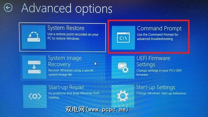 片刻之后,将弹出蓝屏。转到故障排除>高级选项>命令提示符。