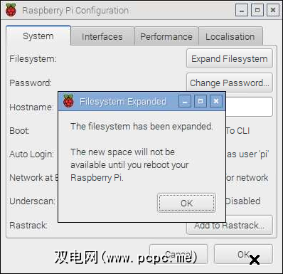在Raspbian桌面上,打开菜单并找到 Preferences> Raspberry Pi Configuration 强>。 系统标签上的第一个选项是扩展文件系统。单击此,然后稍等片刻。您很快就会看到一个确认框,因此请点击确定。请注意以下警告:“只有在重新启动Raspberry Pi之后,新空间才可用。"要利用SD卡的全部存储空间,请重新启动。