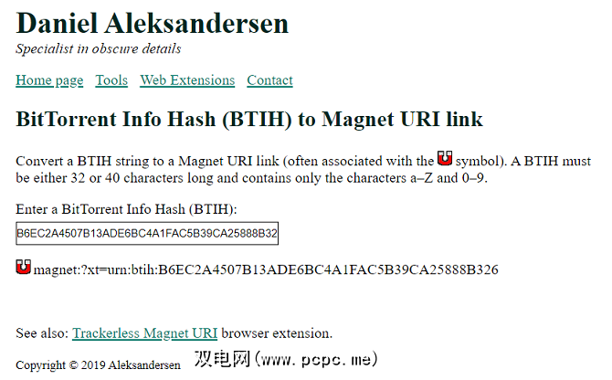 开发人员Daniel Aleksandersen在他的网站上创建了一个哈希到磁转换器。该工具没有正式名称,但其功能与我们研究过的其他转换器一样好。
