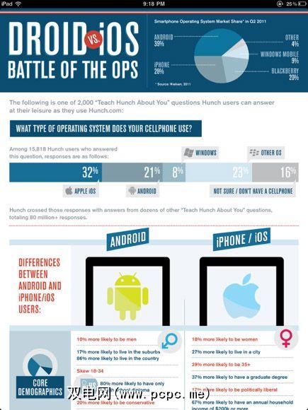 此这项研究基于来自Hunch.com的700,000位用户的“超过8000万次汇总和匿名回复",不仅报告了哪种智能手机操作系统在2011年第二季度占据了市场份额,而且还报告了该智能手机操作系统的价值和个性特征用户。研究表明,例如iOS用户比Droid用户更健康。嗯。