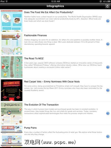 信息图表应用的功能和用户界面非常简单和基本。所有的信息图表都以两列列表的形式下载-具有图形缩略图和带有每个视觉研究描述的标题。可以通过电子邮件,Facebook和Twitter共享信息图表。还为每个信息图提供了到赞助站点的链接。由于该应用程序是基于Web的,因此其内容可以通过《第五专栏》的最新演示文稿自动进行更新。