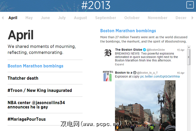 YouTube年末紧随其后综述,Twitter已开始努力将2013年压缩为更易消化的数据集。您可以依次浏览每个月,以发现每个故事最大的故事,推文和主题标签。还有由美国宇航局,时代和英国广播公司(BBC)等合作伙伴精心策划的推文列表。