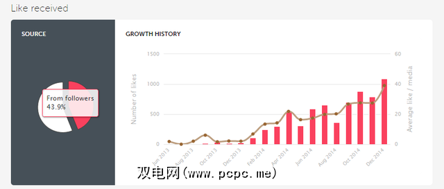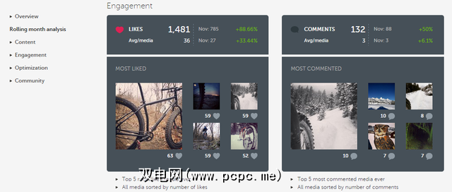 参与度可能是比较吸引人的工具之一,因为您可以查看您帐户整个生命周期内收到的喜欢/评论的直接模式。您还可以查看最喜欢和被评论的媒体。此外,还有一个饼图,显示了来自和不来自关注者的喜欢/评论的百分比。