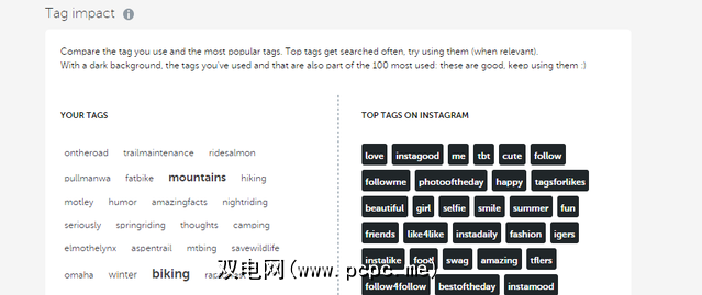 “标签影响"部分的左侧显示您使用过的标签,右侧是Instagram上最受欢迎的标签。在您的主题标签中,一些将是粗体的,代表您最常用的那些。带黑匣子的标签是流行的Instagram标签–如果可以,请尝试将更多标签添加到图像中。也许您会猜到,粗体,黑匣子标签是流行的#标签,您也经常使用。