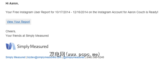 一旦您通过SimplyMeasured对Instagram帐户进行了身份验证并遵循了注册步骤,您将收到一封电子邮件,其中包含指向您的分析的链接。请注意,您只能在24小时内请求两个报告。