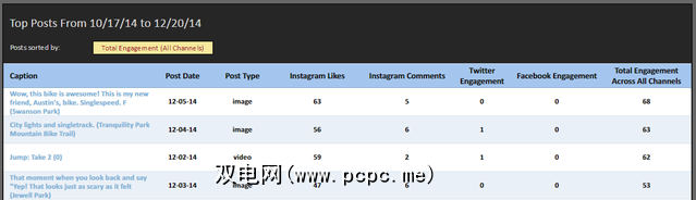 另一个有用的部分(第四部分向下)显示了按发布日期顺序排列的最高职位图表。您可以查看每个媒体的喜欢和评论数量,以及该帖子收到的Twitter和Facebook参与度。