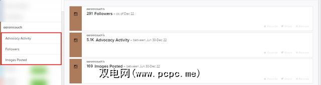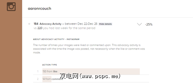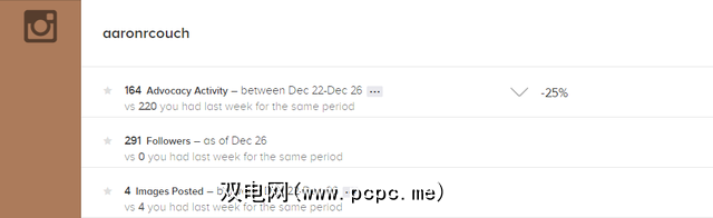 分为三个部分:倡导活动,关注者和发布的图片。宣传活动是您的图片被喜欢和评论的次数。