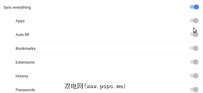 设置,密码,书签(即“收藏夹" "),并且可以分别启用和禁用打开的标签页。这些都位于同步所有内容之下,可以将其切换为启用或禁用所有选项。
