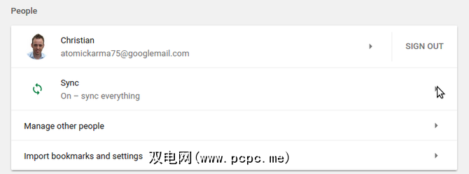 在Windows和新的Linux操作系统之间可以进行相同的同步。只要确保您已启用同步即可。通常默认情况下处于打开状态,您可以在Chrome 设置菜单中的人下找到它。