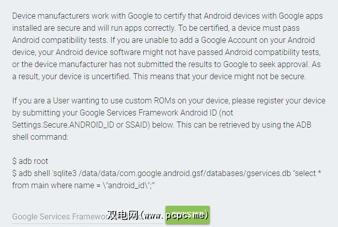 幸运的是,该公司提供了一种解决方法。访问Google的设备注册页面,以获取有关使用ADB命令提取GFS ID的信息和说明。这样做会将设备注册到您的Google帐户,并允许您正常使用Google应用。