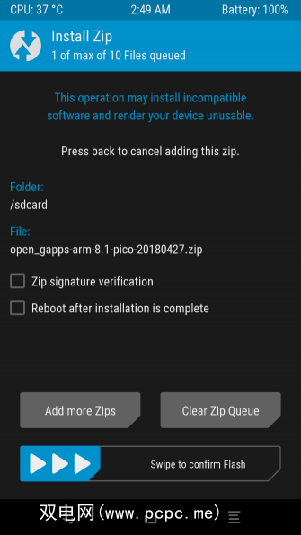在恢复过程中,选择安装选项(在TWRP上为 Install ,从sdcard安装zip "),然后浏览以选择ZIP文件。接下来,选择要刷新的选项(在TWRP中滑动以确认刷新;只需在CWM中选择),然后等待在设备上安装Google Apps。