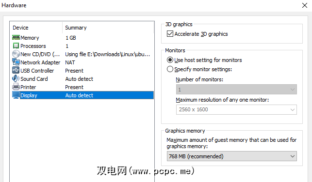 最后,请花一点时间检查显示设置。在这里,您可以切换3D加速度,并决定是要使用主机的显示器设置还是要在虚拟机中设置多个显示器。图形内存也可以进行调整-与来宾OS的系统内存一样,也会显示建议的数量。