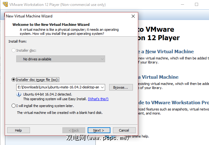 完成此操作后,将加载主VMware Workstation Player应用程序。点击创建新虚拟机以继续。选择默认选项安装程序光盘映像文件(iso)。 (可以使用我稍后将安装操作系统选项来简单地创建带有空白硬盘的虚拟系统。)