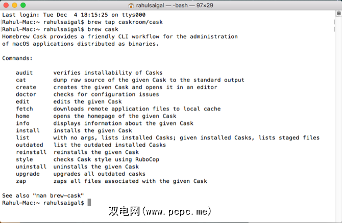 brew cask此语法将告诉您Cask支持的命令。每次使用命令时,请不要忘记先添加酒桶。您需要记住的最常用的命令是: