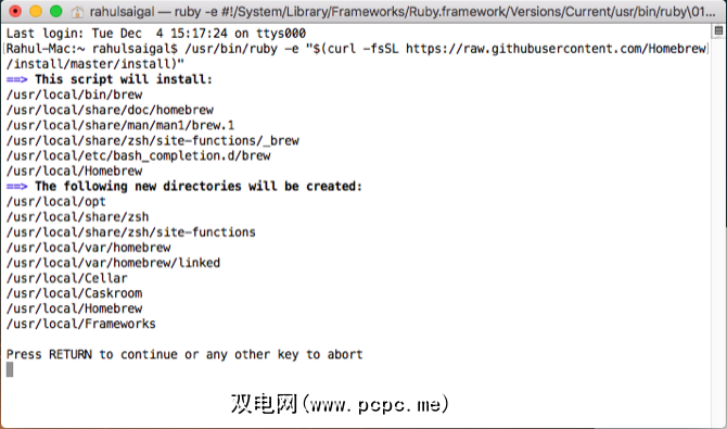 /usr/bin/ruby -e "$(curl -fsSL https://raw.githubusercontent.com/Homebrew/install/master/install)"粘贴此命令时,您将看到一系列有关以下内容的行该脚本将安装在哪里。再次按返回继续,或按其他任意键取消。