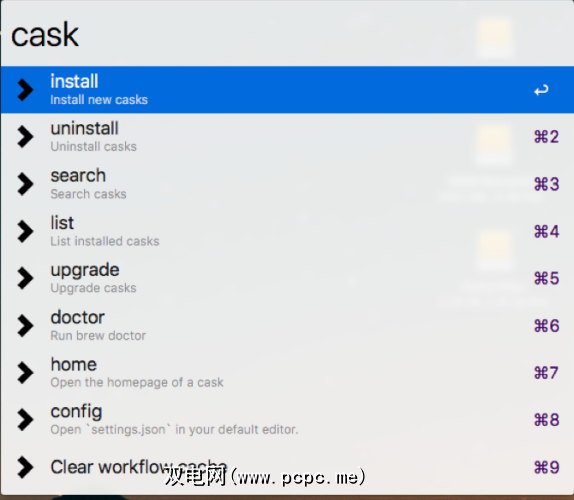 Alfred的Homebrew和Cask Workflow,您可以轻松地串联安装,卸载和管理Homebrew和酒桶。该脚本通过支持医生,安装,列表,搜索,卸载等。