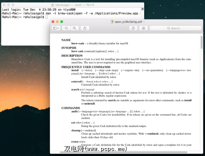 man -t [Command Goes Here]|open -f -a /Applications/Preview.app例如,以下字符串将在预览中打开酒桶的手册页: