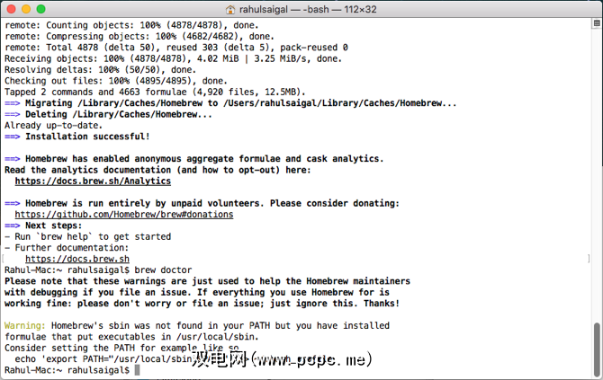 brew doctor如果您会看到任何警告消息,可以放心地忽略它们,但是您应该检查可能会影响Homebrew安装的常见问题。在大多数情况下,如果您的macOS和命令行工具/ Xcode的副本是最新的,则不会看到任何错误。