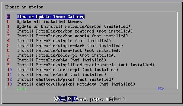 在这里,您将看到RetroPie Setup视图。继续选择第一个选项 Download Theme Gallery ,然后等待图库下载。 (请注意,如果您不想等待画廊,可以简单地向下滚动并从列表中选择一个主题。)