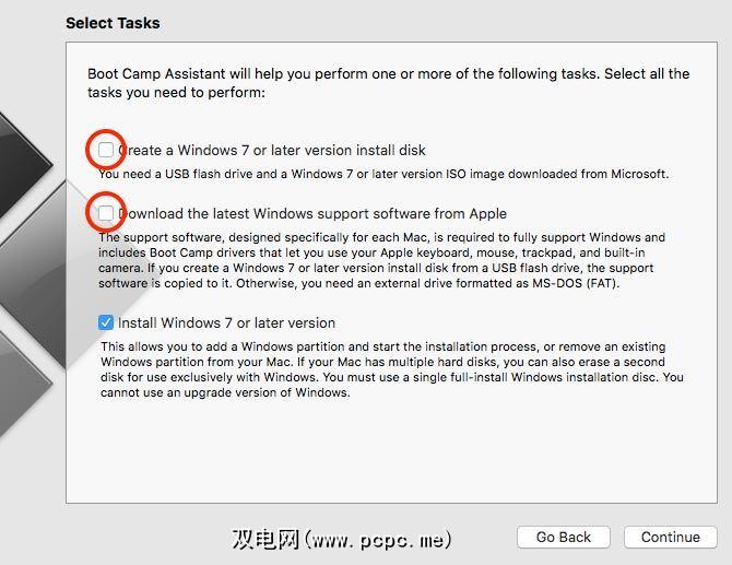 在USB驱动器仍处于连接状态的情况下,启动 Boot Camp助手再次>。点击继续开始该过程,然后取消选中创建Windows 7或更高版本的安装磁盘,然后从Apple下载最新的Windows支持软件。您已经完成了这两项操作。