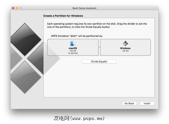 选中安装Windows 7或更高版本,然后单击继续。在下一个屏幕上,系统将要求您为Windows分区分配空间。单击并拖动滑块(或单击等分),以确定如何在macOS和Windows分区之间共享此空间。
