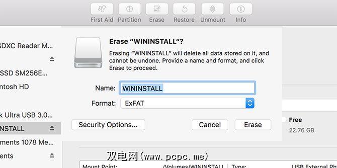 插入USB驱动器并启动 Disk Utility 。从左侧的列表中选择您的驱动器,然后单击擦除(确保其中没有未备份的内容)。在下拉框中,选择 exFAT 作为文件系统。为您的USB驱动器命名为 WININSTALL ,然后单击 Erase 。