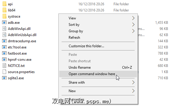 解压缩后,您实际上不需要安装任何东西。您只需在SDK Platform Tools文件夹中打开命令提示符。浏览到该文件夹,按住 Shift 并右键单击。然后从上下文菜单中选择在此处打开命令窗口。