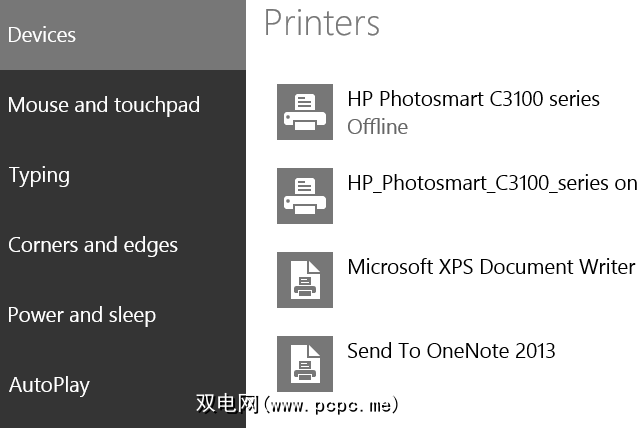 或者,在Windows 8中打开超级按钮栏,点击 PC设置> PC和设备>设备>添加设备还将打印机添加到Windows。