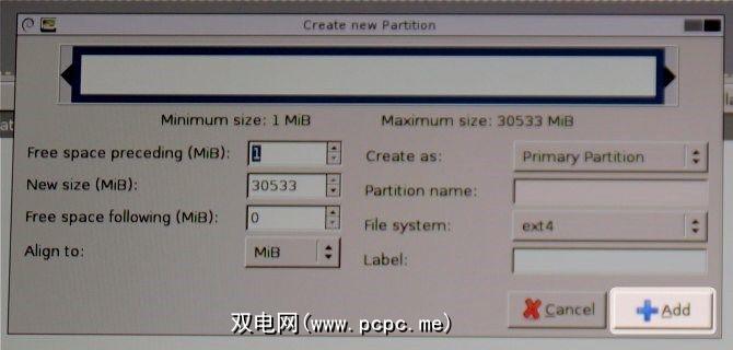 下一个菜单将显示分区的大小。默认大小和文件系统(EXT4)完美运行。只需左键单击添加。现在,您已经为Remix OS准备了存储驱动器。您可以通过单击屏幕右上方的黑色正方形来退出GParted。您可以通过双击红色退出图标来退出GParted应用程序。出现提示后,从计算机上卸下GParted驱动器。