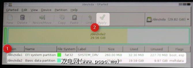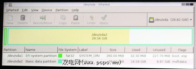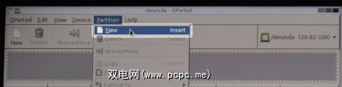 在几个加载屏幕之后,将显示GParted界面。您应该看到以下菜单: