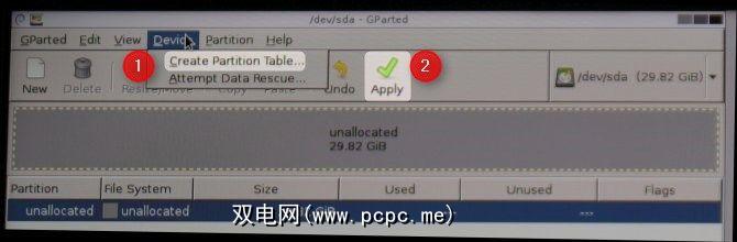 现在,您有了干净的存储驱动器,需要一个分区。首先,从屏幕顶部选择设备,然后左键单击创建分区表。其次,左键单击应用。这将在磁盘上创建一个新的分区表。您会收到一条警告,提示您的数据将被删除。 选择“应用" 。下一步:在驱动器上创建分区。