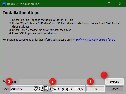 与对GParted进行镜像的方式相同,请使用Jide的修改了UNetbooin的版本以将Remix OS的ISO刻录到可启动驱动器上。该程序位于包含Remix OS的ISO文件的同一程序包中。文件名是“ Remix_OS_for_PC_Installation_Tool"。您可以使用上面详述的步骤。 GParted和Remix OS之间的唯一区别是Remix OS需要至少8 GB的USB驱动器。 Jide的官方说明提到USB 3.0是必需的,但是由于您要将Remix安装到硬盘驱动器上,因此可以忽略它。