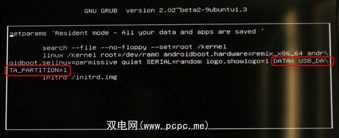 您将看到Linux(或UNIX)命令列表。使用键盘的方向键导航到条目“ DATA = USB_DRIVE_1" ,并用“ INSTALL = 2" 替换它强>。编辑文本之前,它应该看起来像这样(不需要的文本用红色圆圈圈出):