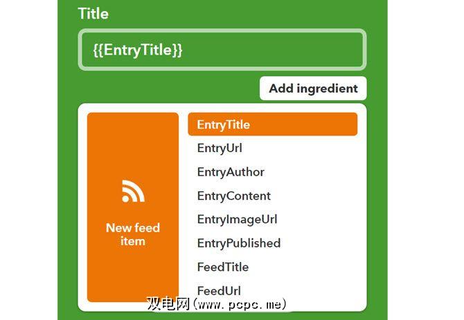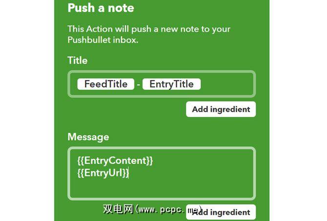 选择 Push a note 操作。在下一页上,您可以根据传入RSS源信息中的“成分"来自定义通知标题和消息。